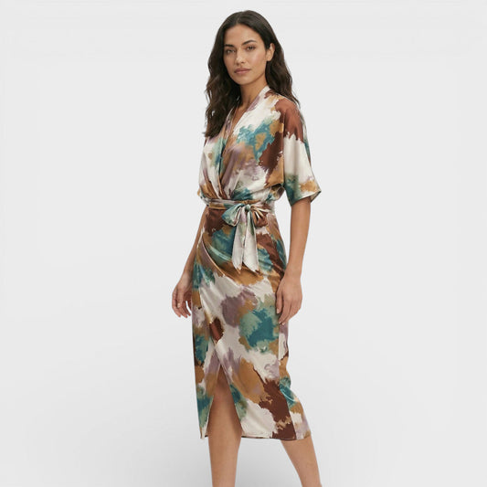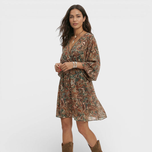 Valeria | Vestido midi bohemio fruncido con estampado artístico