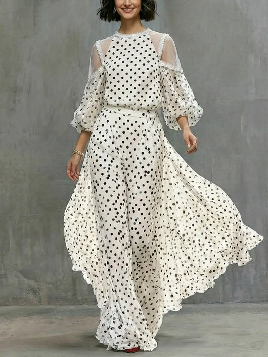 Valeria | Vestido largo fluido con estampado de lunares y hombros abiertos