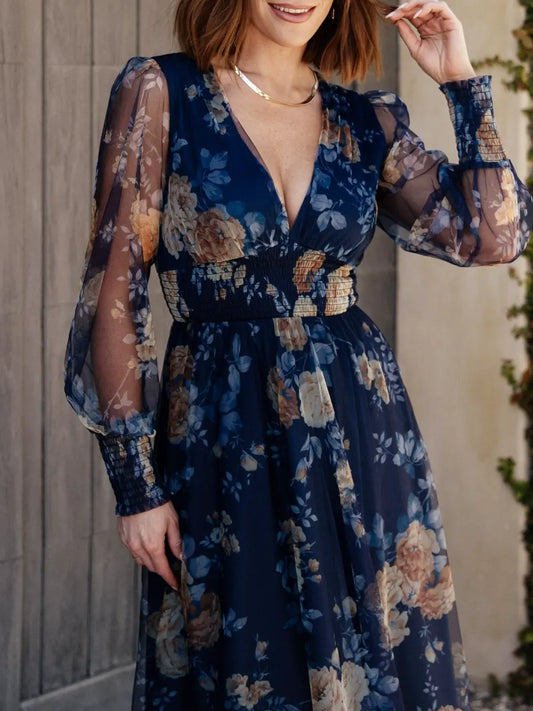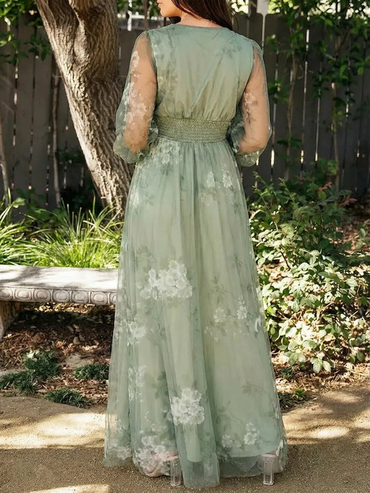 Lirena | Vestido largo fluido con bordado floral y mangas transparentes