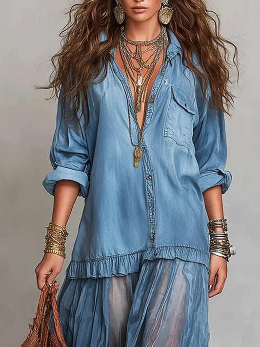 Jimena | Vestido maxi casual de arte patchwork en denim con solapa retro para mujer