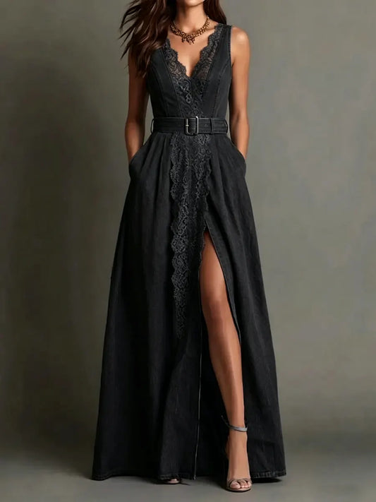 Aitana | Vestido vaquero de estilo vacacional para mujer con encaje, cuello en V y sin mangas